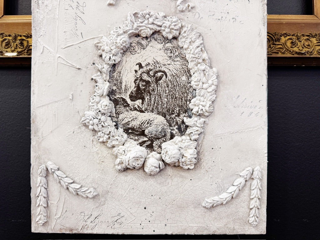 Our lovely IOD Artisan Alena Lara is sharing her process for creating a decorative cross relic that feels collected and rich with detail. She starts by casting the Les Croix Mould in quick-set resin and test-fitting her layers in a thrifted frame, then builds a moody foundation with burgundy chalk-type paint.